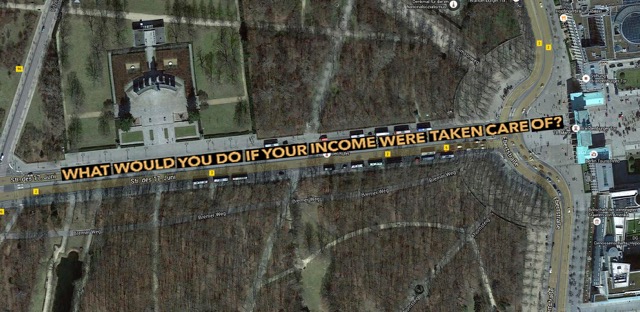 > Aus dem größten Plakat der Welt in Genf – siehe „Weltrekord fürs Grundeinkommen – wird das längste Plakat der Welt in Berlin.