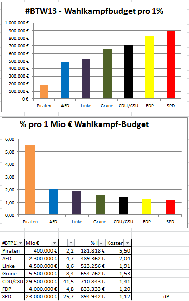 Hier eine interessante Grafik von @derPUPE, die die gewonnnen Stimmen in Verhältnis zu den finanziellen Mitteln, die die Parteien aufwenden konnten, setzt: