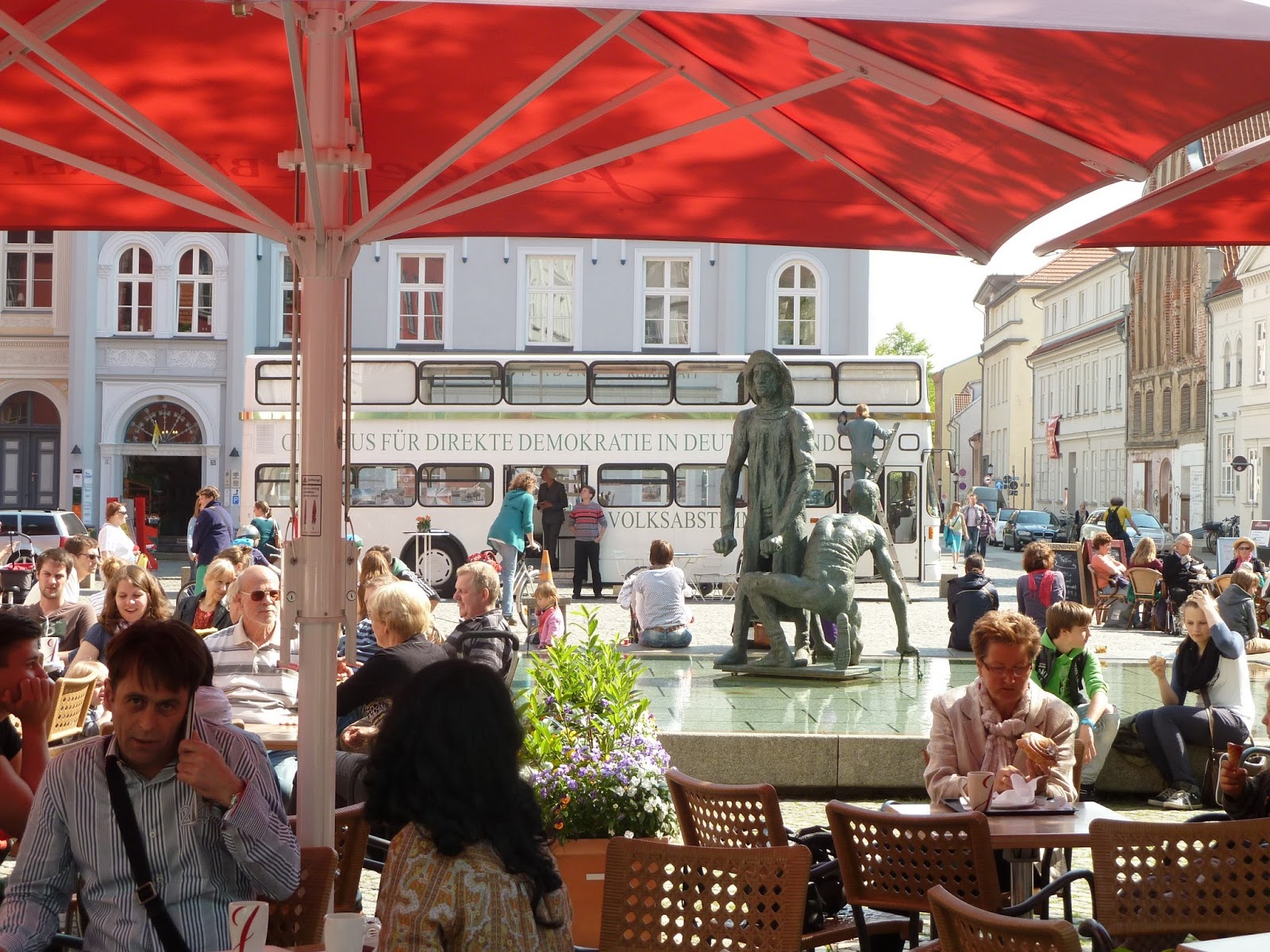 …und Dienstag und Donnerstags, wenn auf dem historischen Markt die Stände des Wochenmarkts aufgebaut sind, fuhr der Omnibus um die Ecke und stand auf dem kleineren Fischmarkt..